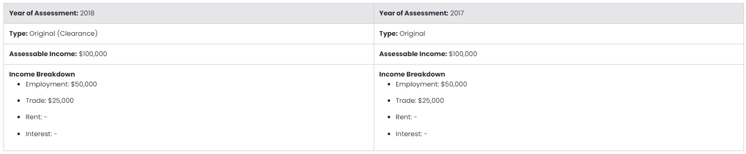 * Year of Assessment, Type and Tax Clearance (if applicable), Assessable Income and Income Breakdown must be displayed clearly.