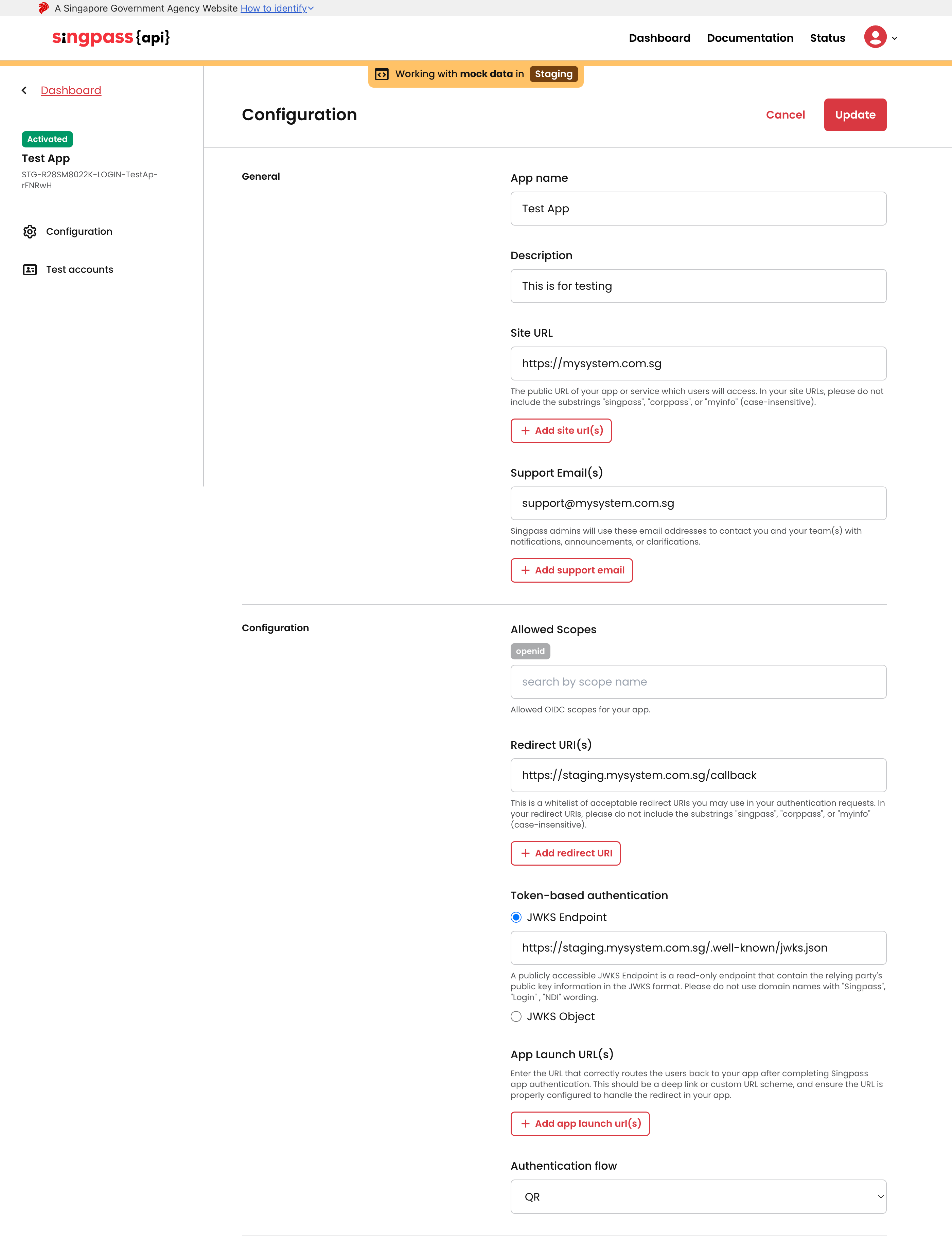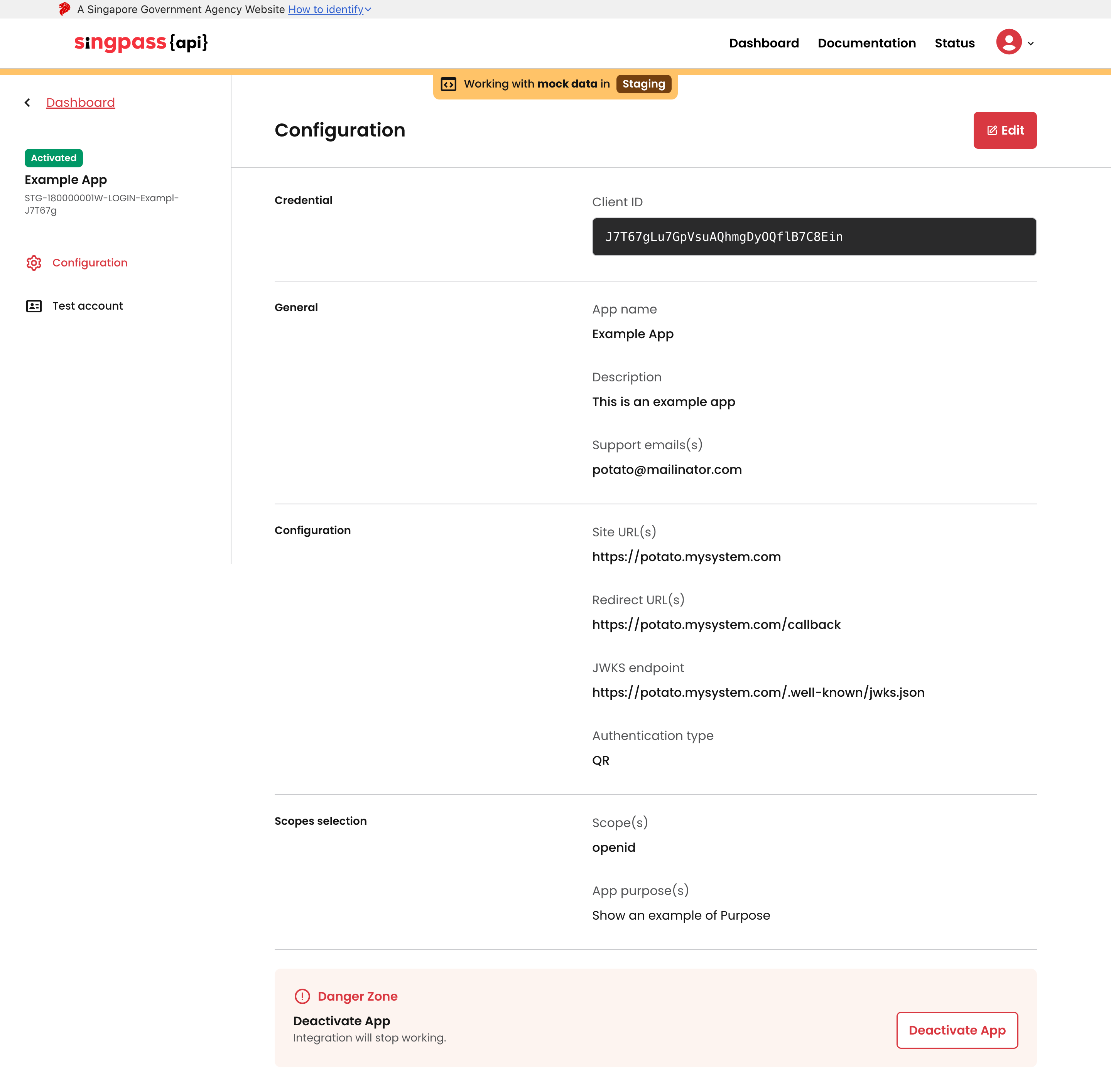 * You have to be successfully logged into [Singpass Developer Portal](https://developer.singpass.gov.sg) before you can edit Staging App.